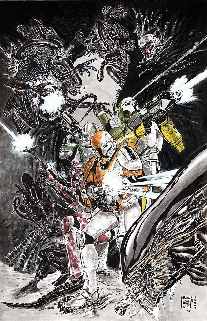 Darth Vader versus the Xenomorphs (the creatures as they are officially known from the Alien franchise)