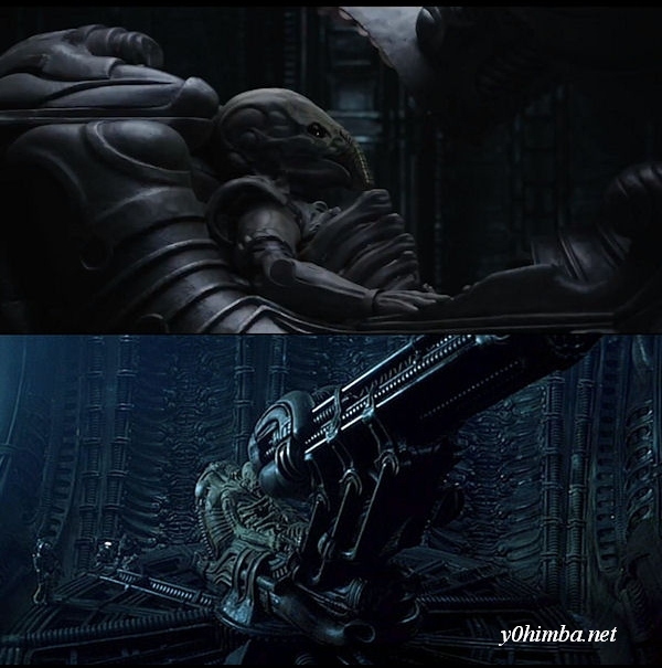 A comparison between the Space Jockey from the original Alien movie and a scene picked from the trailer for the upcoming movie, Prometheus.
